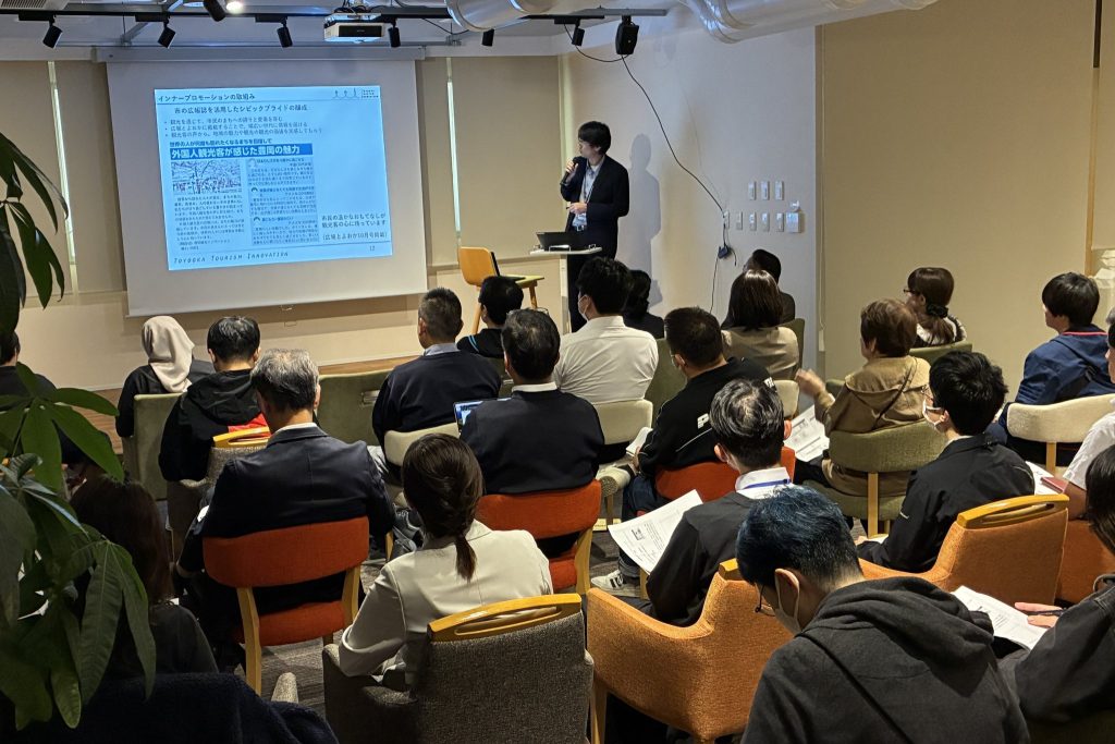 第1部では、豊岡観光イノベーションの事業報告会を実施しました。ここでは、訪日観光客全体の動向と豊岡市の最新インバウンド情報をデータに基づき紹介。インバウンドを受け入れるための食対応やガイド養成についてご説明しました。また、観光への理解を深めるため、広報とよおか10月号に掲載された「観光客の声」についてもご紹介しました。
